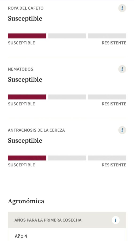 Además, esta variedad tarda aproximadamente cuatro años en dar su primera cosecha, en comparación con los tres años de otras arábicas.